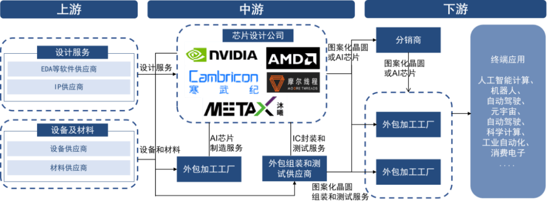 下游为GPU应用领域。分销商负责销售GPU,而系统制造商则负责将GPU集成到终端产品中,并最终交付给品牌商。最终应用下游包括AI计算加速、机器人、自动驾驶、元宇宙、数字孪生、科学计算、工业自动化、消费电子等众多行业。