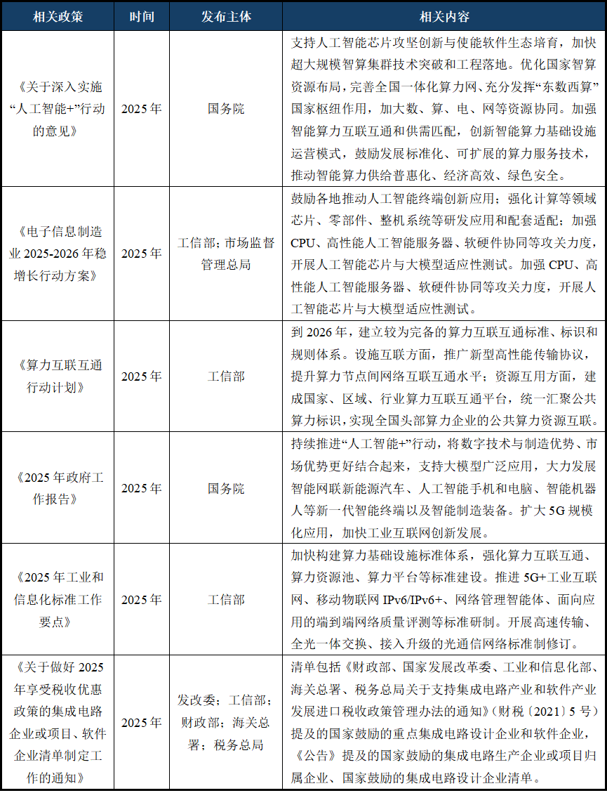 近年来,国内GPU行业政策围绕“自主可控、算力升级、生态协同”的核心主线,从国家战略规划、专项政策扶持、产业链协同、应用场景拓展、资本与金融支持等多个维度持续发力,推动GPU通用技术标准与行业规范落地,提升国产产品的兼容性与安全性,有力促进了GPU行业的发展。2025年来国家颁布、实施的主要政策法规如下: