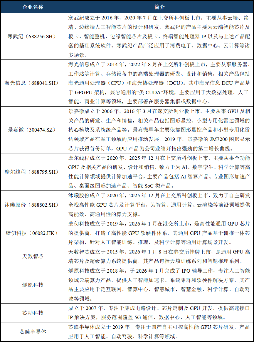 2025-04-28 2025年末至2026年初,摩尔线程、沐曦股份、壁仞科技等接连完成上市,市场反应热烈。这一些系列事件标志着中国GPU行业已进入产业化与资本化深度联动的新阶段。