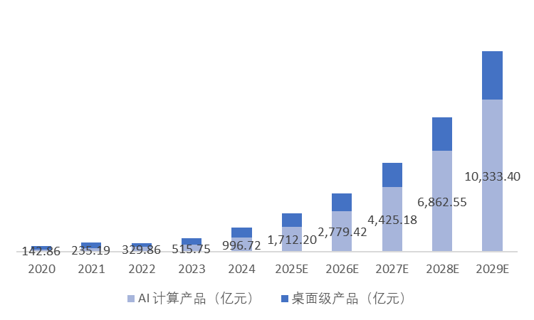 过去五年,中国GPU产业呈现快速增长态势,市场规模从2020年的384.77亿元快速增长到2024年的1,638.17亿元,预计在2029年将达到13,635.78亿元,在全球市场中的市场占比预计将从2024年的15.6%提升至2029年的37.8%。其中,AI智算GPU仍是增长核心,到2029年,中国AI智算GPU市场规模将达到10,333.40亿元,期间年均复合增长率为56.7%;桌面级产品亦稳步发展,预计从2024年的641.45亿元增至2029年的3,302.38亿元。